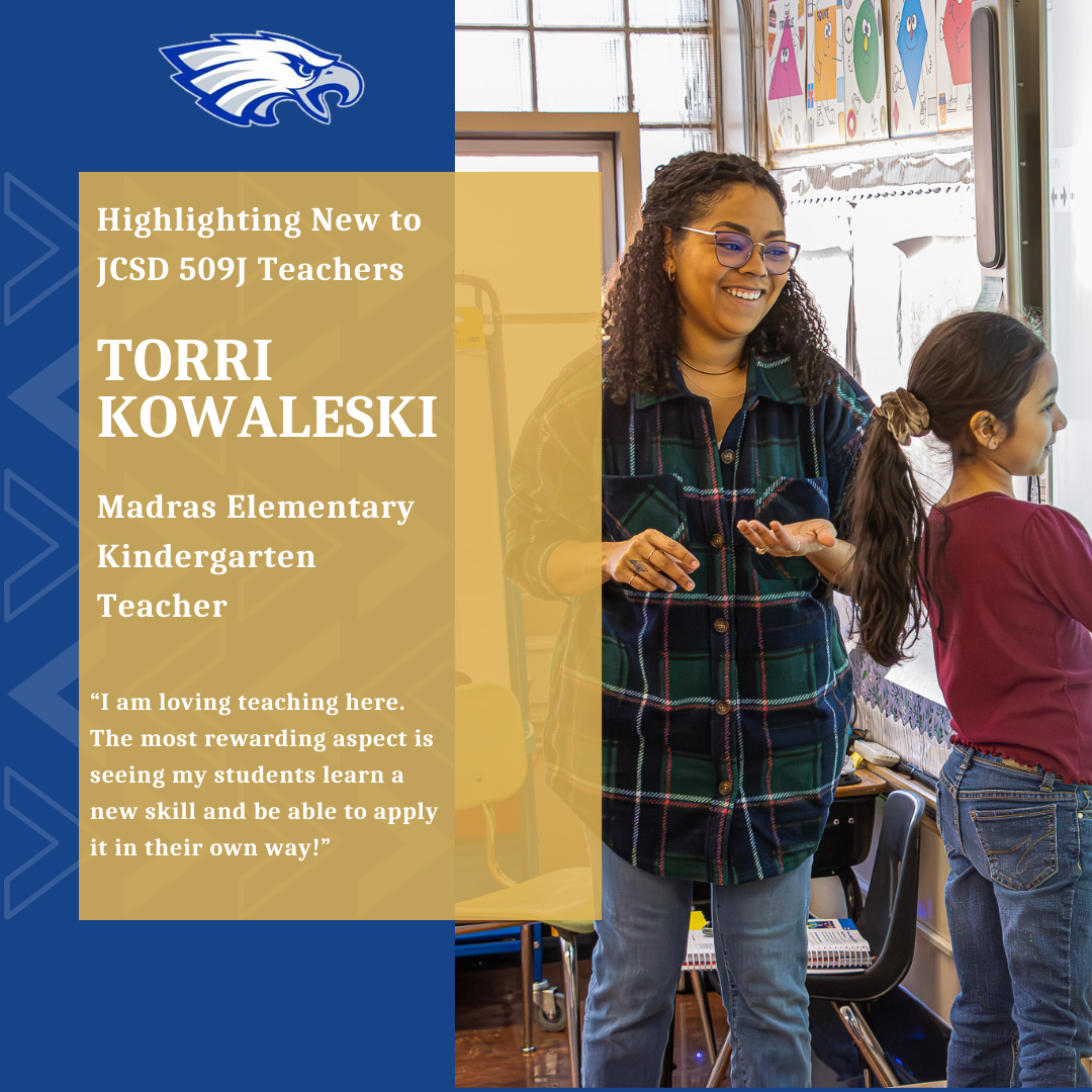 So far, Torri has enjoyed working for JCSD 509J. She is currently teaching kindergarten at Madras Elementary and she is loving it.