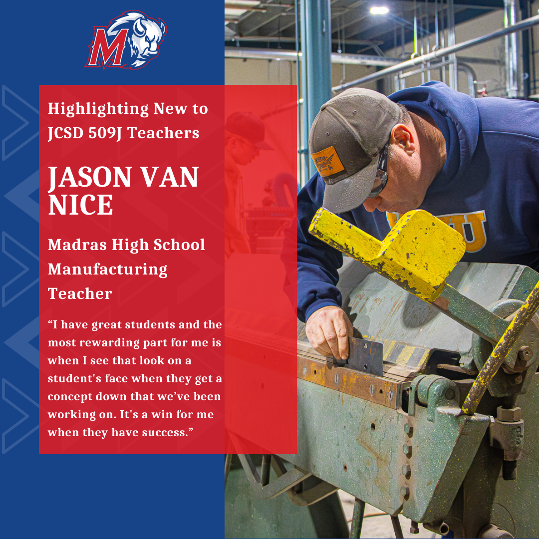 Jason Van Nice is our manufacturing teacher at MHS this year. He wanted to be a teacher when he first started college. However, he found himself down a different career path and went into manufacturing and engineering.