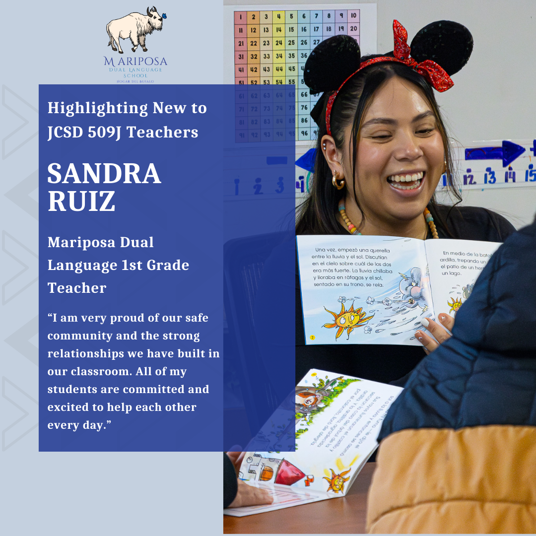 Sandra Ruiz is one of our 1st grade teachers at Mariposa Dual Language this year. Prior to teaching, Sandra was an educational assistant for JCSD 509J at Buff Elementary for several years. She served English Language learners during her time there.