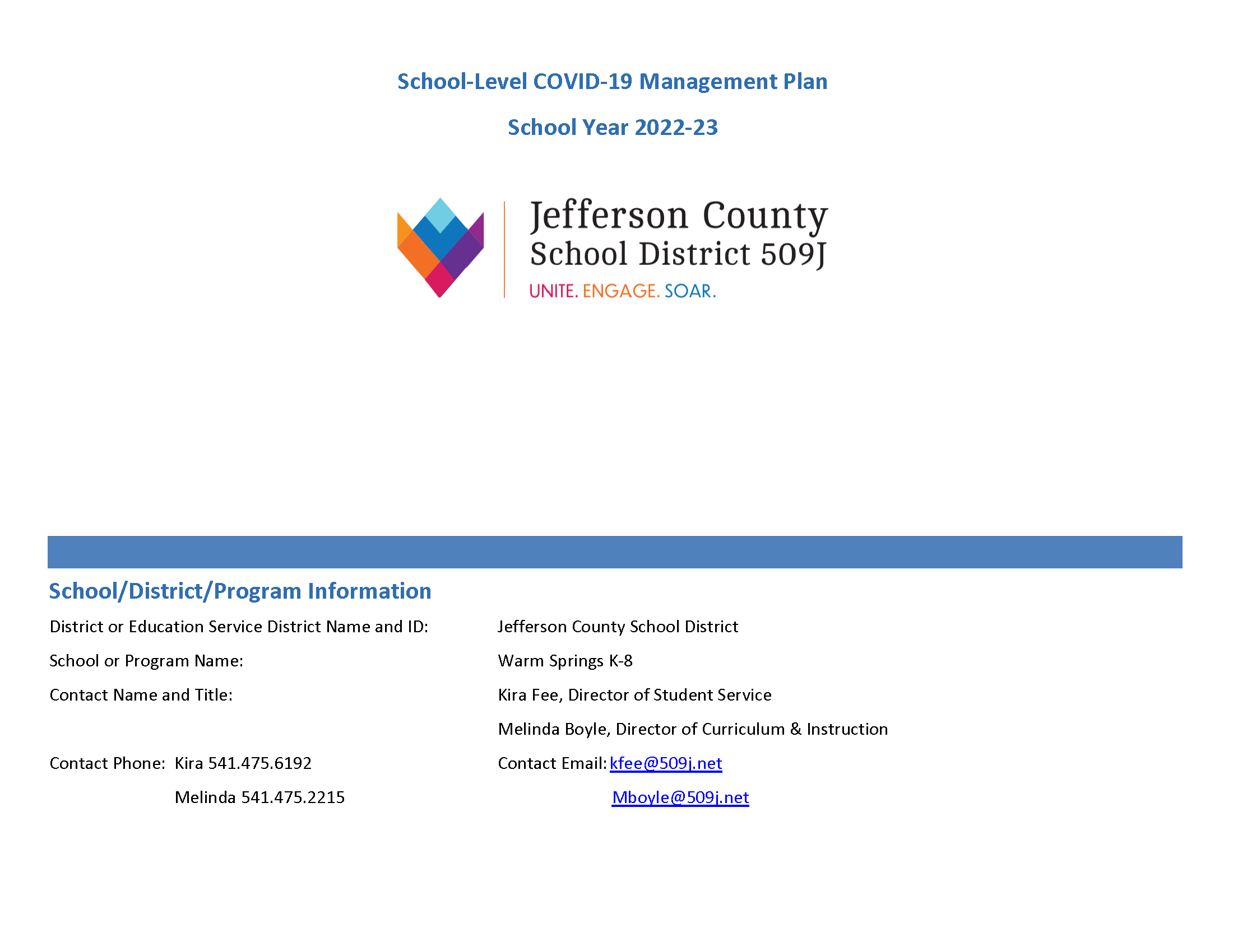 COVID-19 Management Plans Elementary Plan – Covers Madras, Buff, Metolius Elementary Schools and Big Muddy School. Warm Springs K8 Academy Plan Middle School Plan – Covers Jefferson County Middle School and Dual Language Program High School Plan – Covers Madras and Bridges High Schools