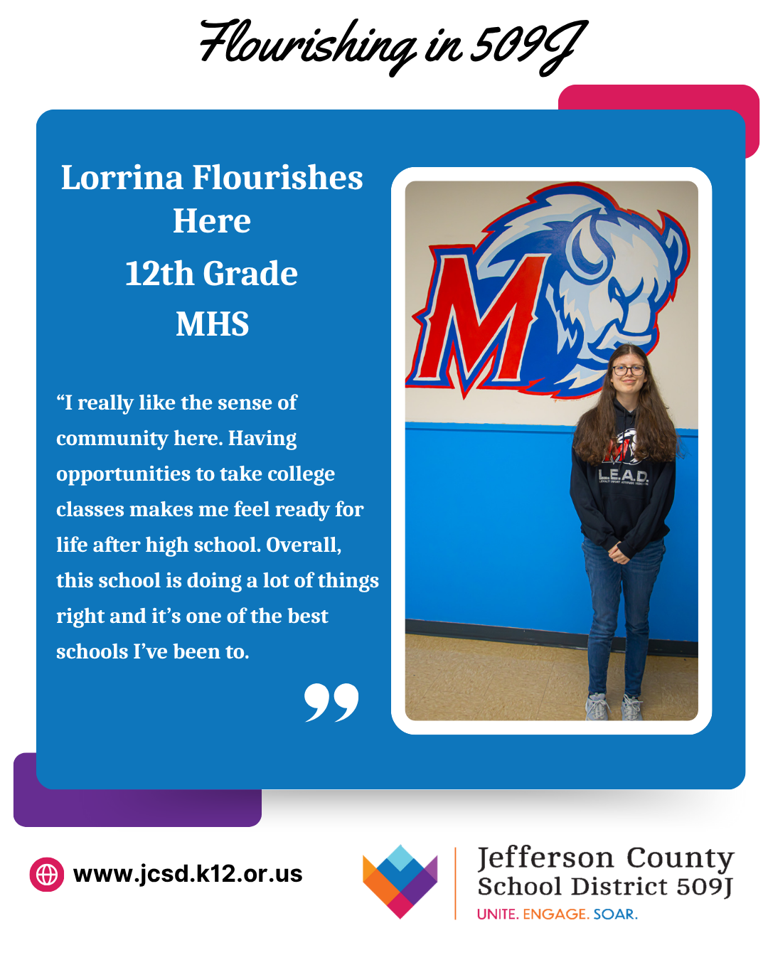 “I am nominating Lorrina Doust for Flourishing in 509J because she truly goes above and beyond as both a student and a community member. She is active in many clubs, including Graphic Arts Club, Astronomy Club, and Environmental Club, and she shows up to every event with a smile and a helping hand. In the classroom, she is a dedicated learner who consistently performs at the top of her classes…not just for the grade, but because she genuinely loves learning. Her positivity, work ethic, and willingness to support others make her an integral part of the Madras High School community. She leads by example, demonstrates school spirit, and has a meaningful impact on those around her.”