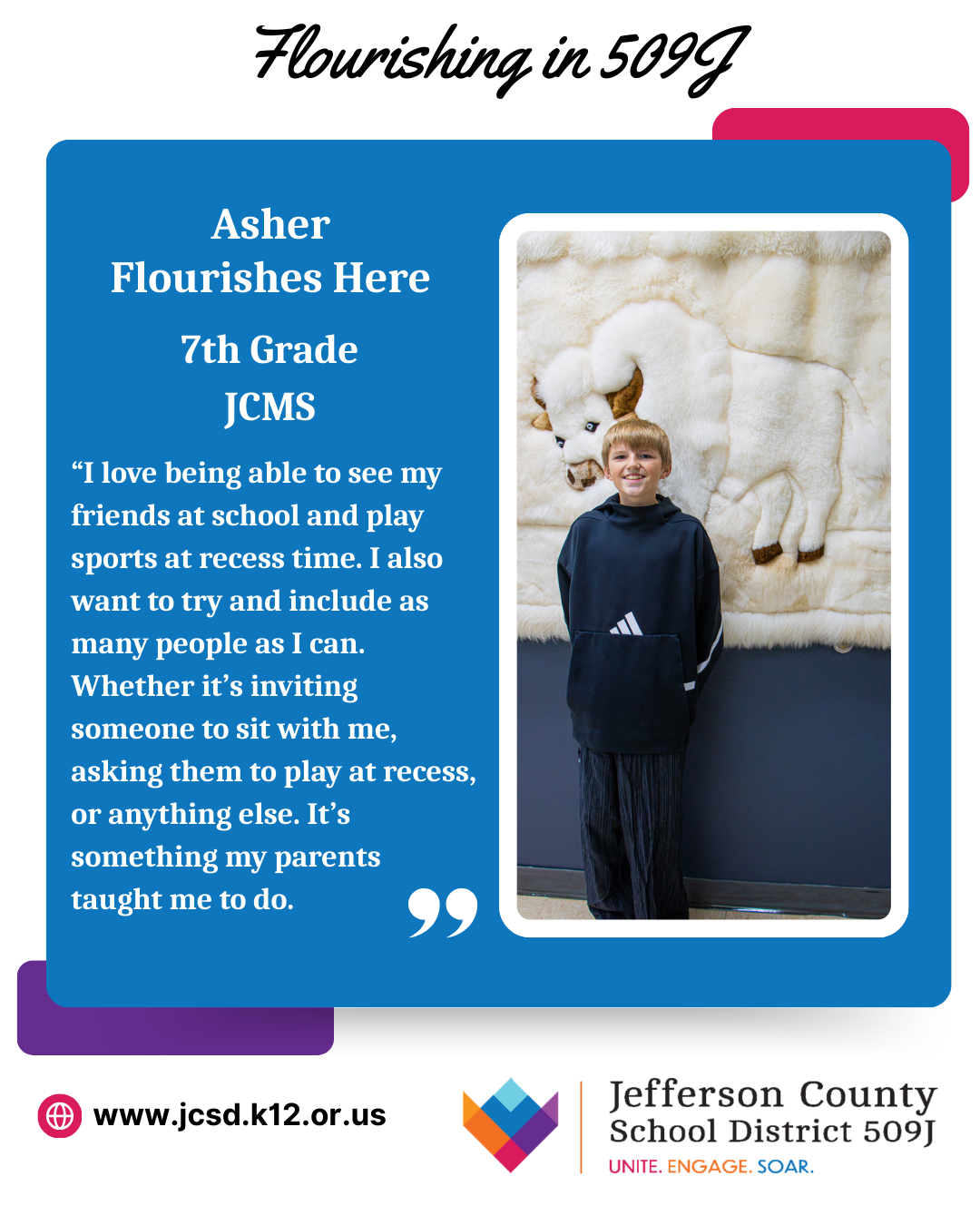 The next student we’re highlighting is Asher Challacombe! He’s a 7th grader at JCMS!