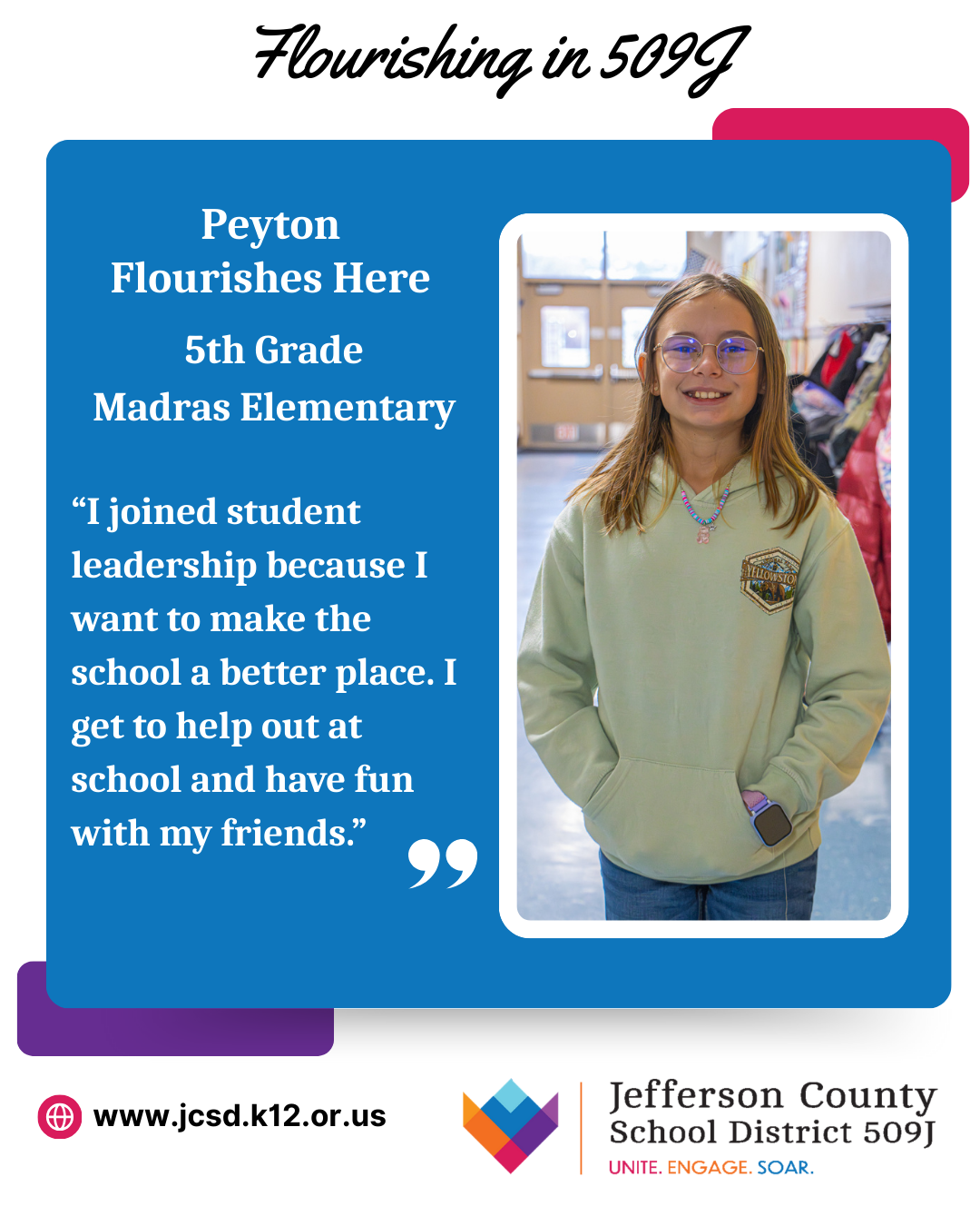 The next student we’re highlighting is Peyton Tarvin! She’s a 5th grader at Madras Elementary.