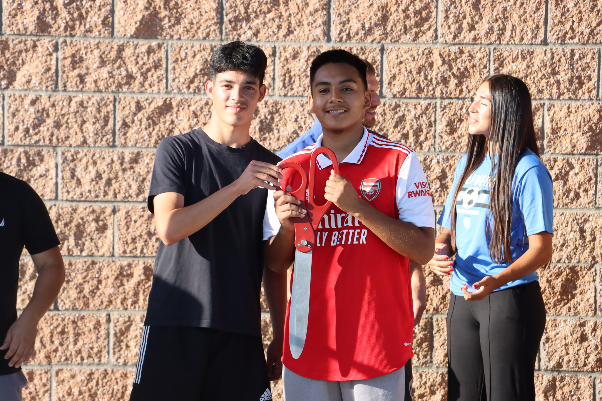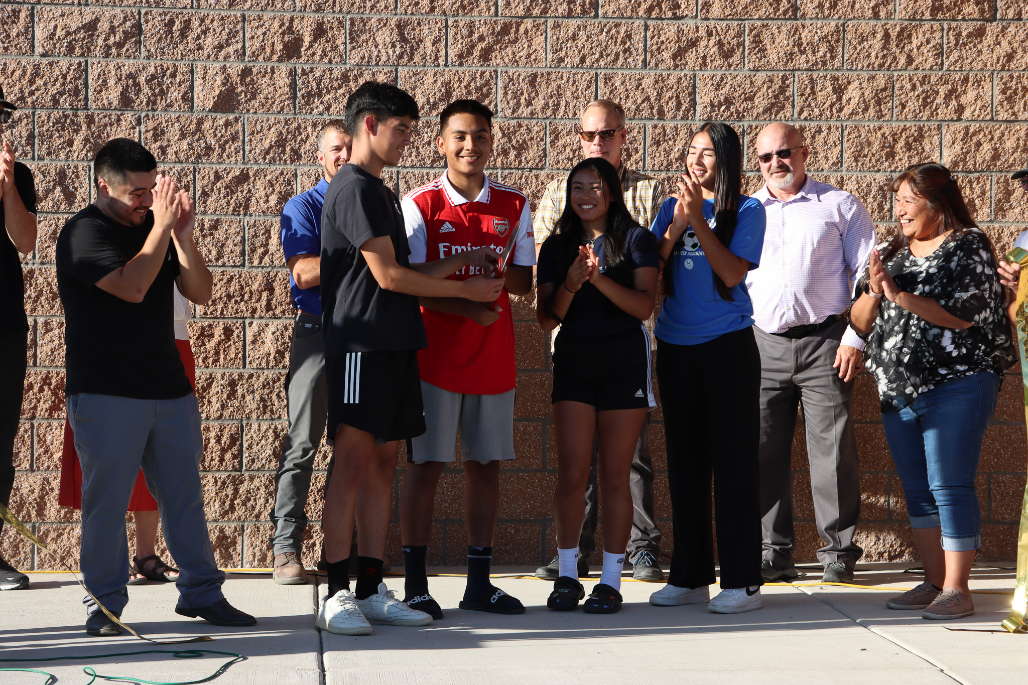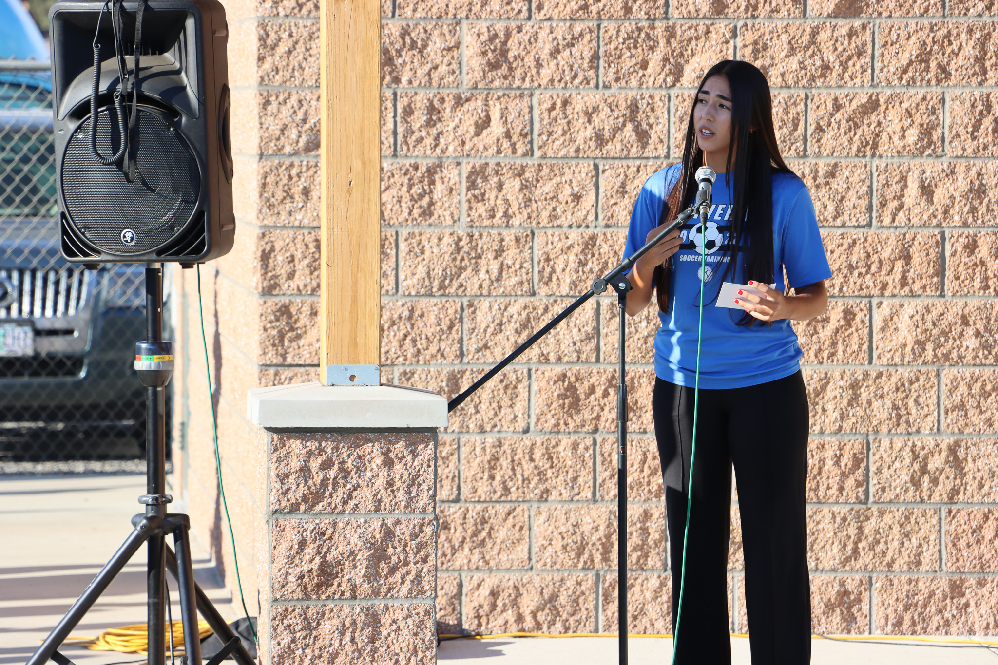 Four speakers delivered inspiring speeches. Superintendent Jay Mathisen and board member Laurie Danzuka offered their unique perspective on the impact of this soccer complex on our students and the soccer community in Jefferson County. Two Madras High alumni, Erika Olivera and Imer Gutierrez, spoke from the heart about how playing soccer at Madras High shaped their character. They emphasized the life skills acquired like perseverance and how that has helped shape their life post high school.