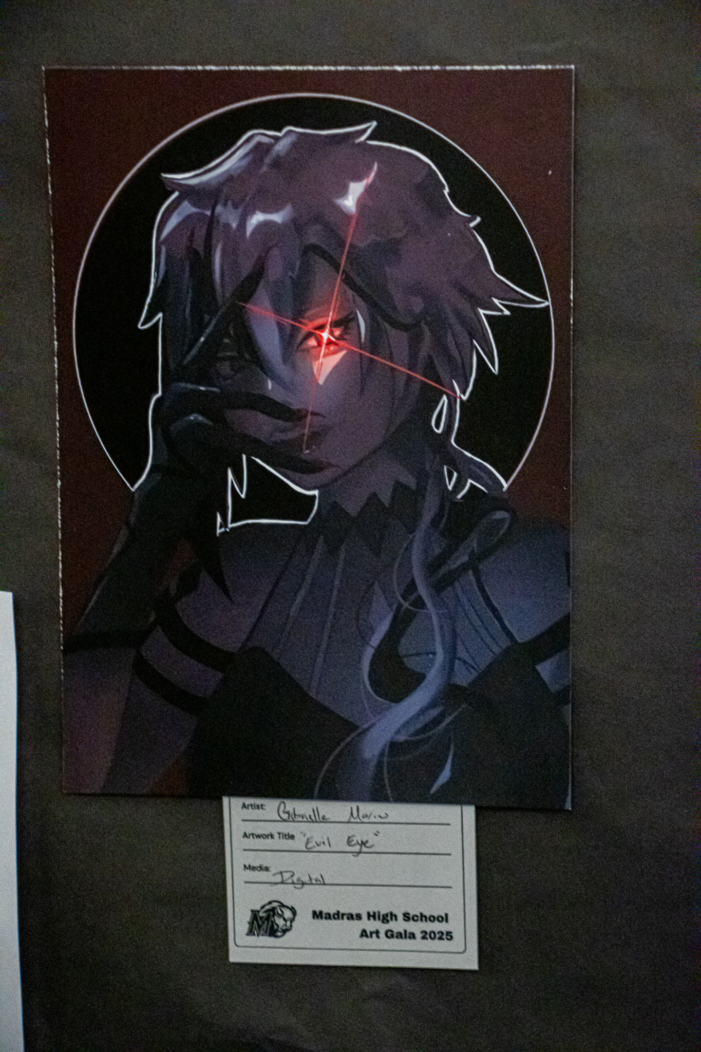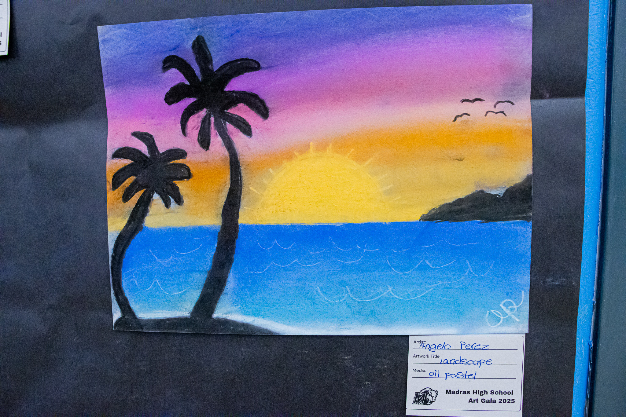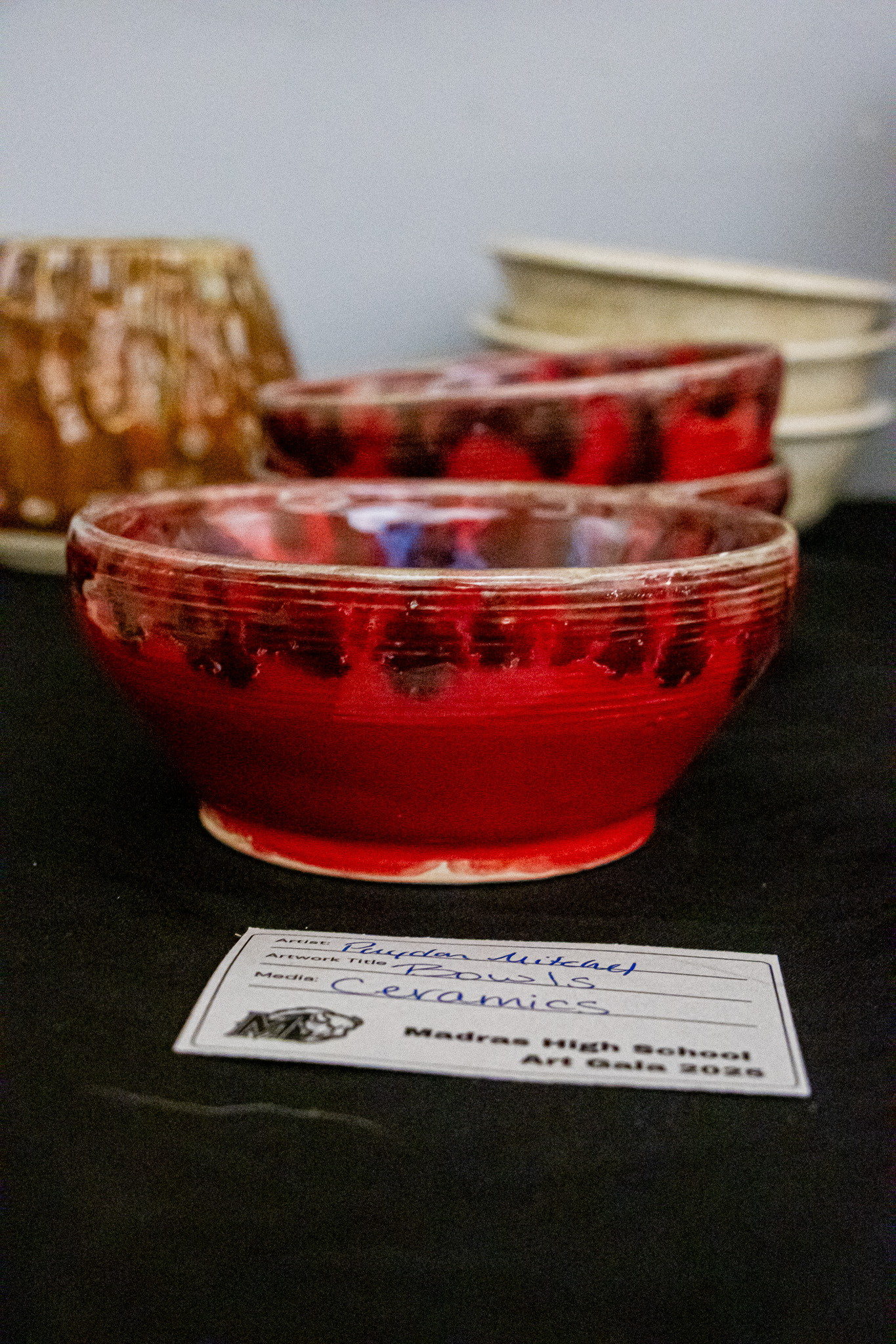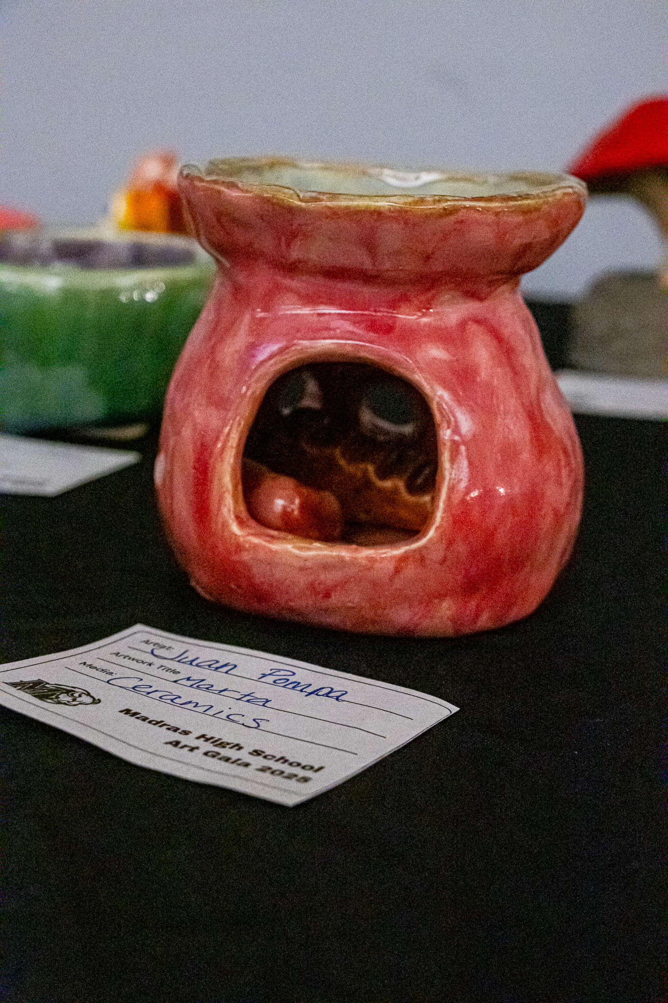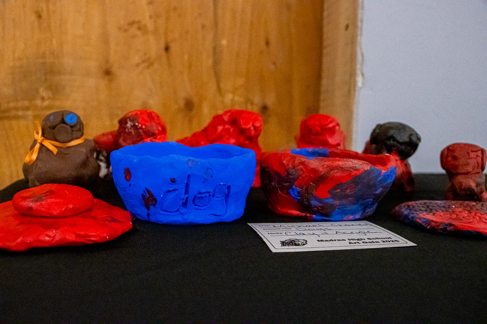For the first time in its history, the commons of Madras High School was transformed into a vibrant art gallery for our inaugural Art Gala. Student artwork covered the walls and tables inside the commons. This included different mediums of art like ceramics, paintings, graphics, photography, and more.