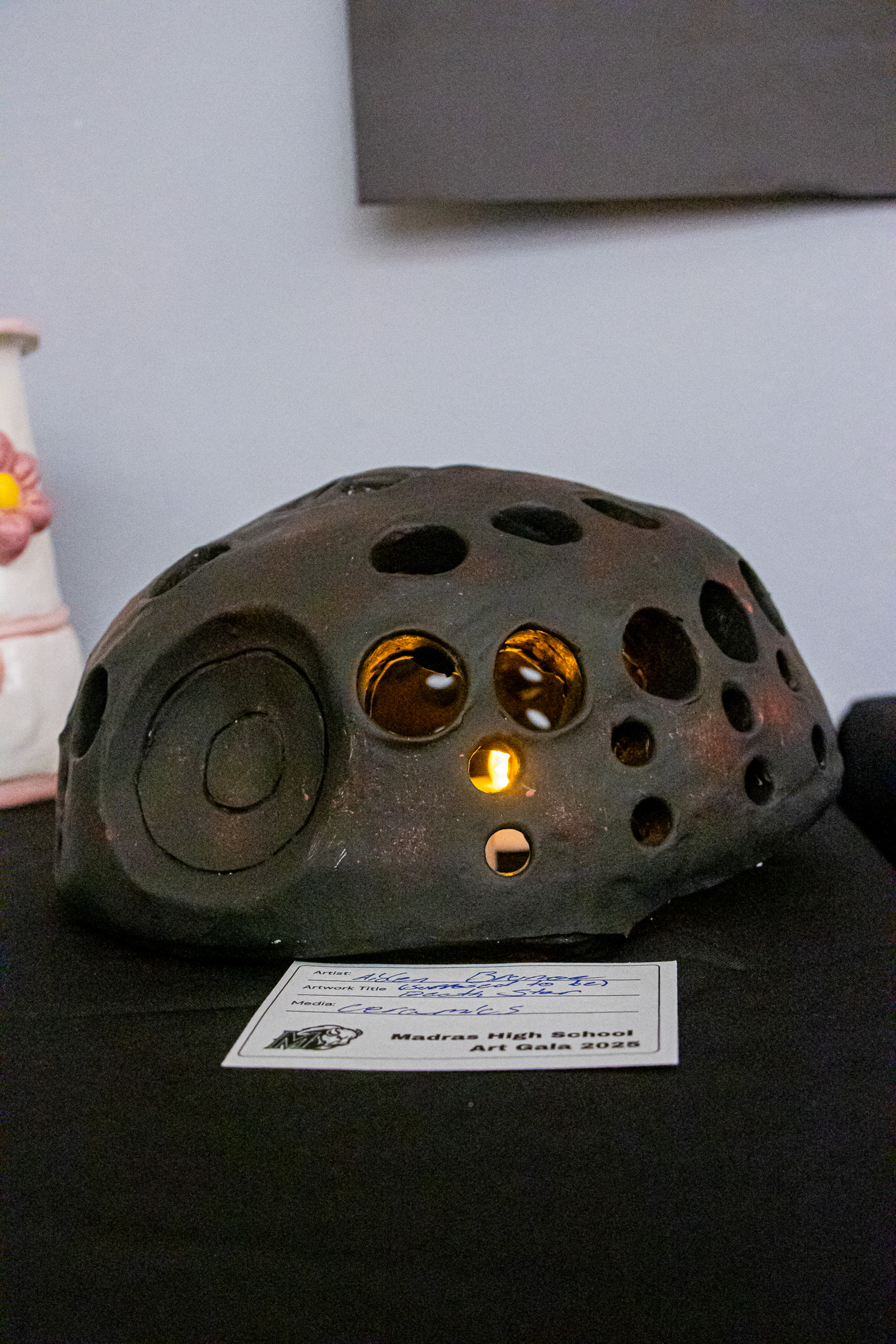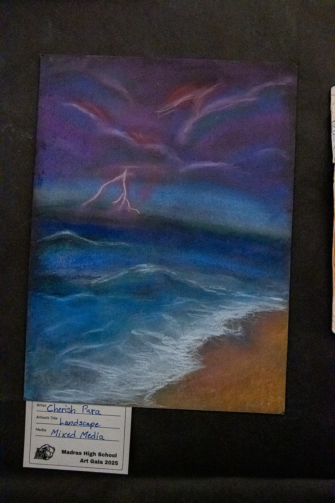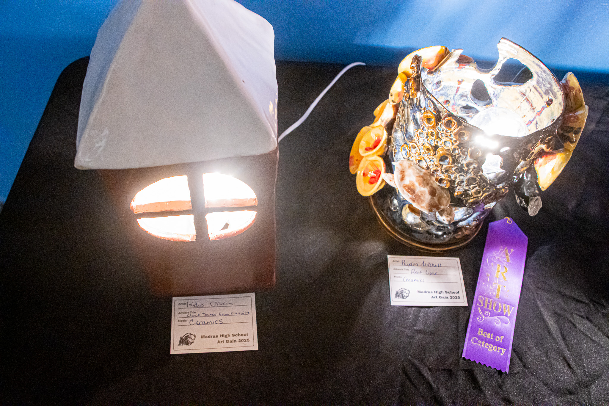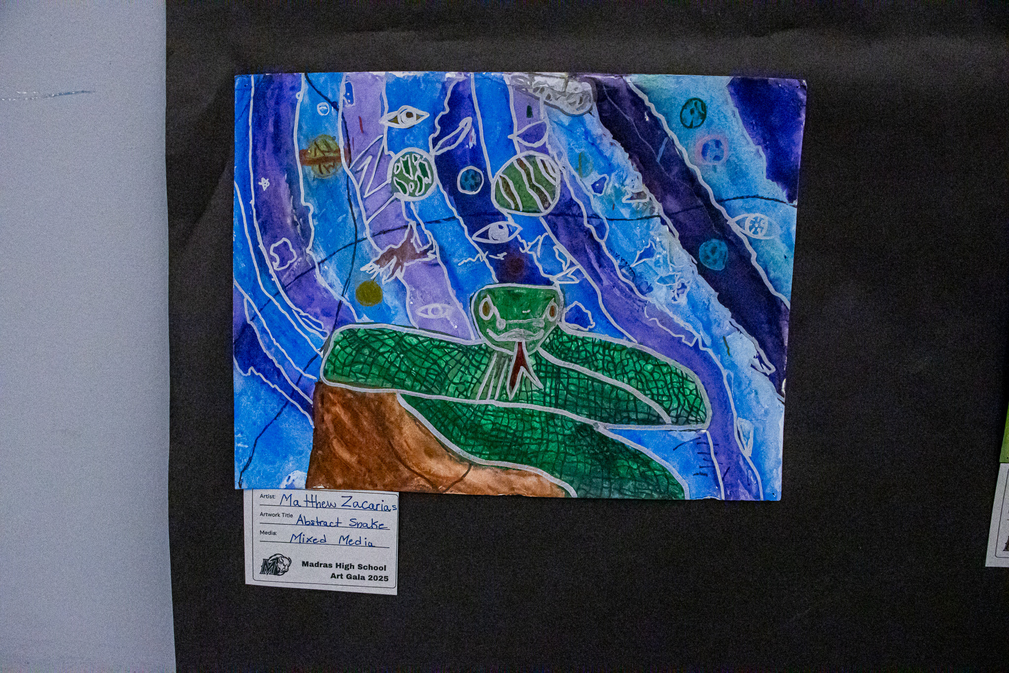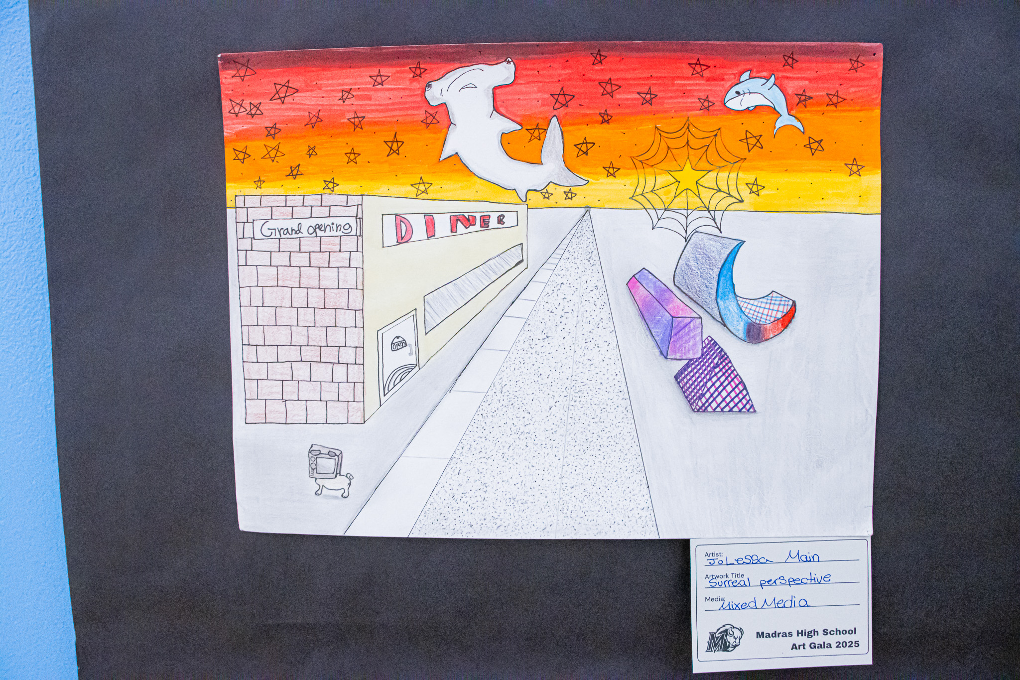 For the first time in its history, the commons of Madras High School was transformed into a vibrant art gallery for our inaugural Art Gala. Student artwork covered the walls and tables inside the commons. This included different mediums of art like ceramics, paintings, graphics, photography, and more.