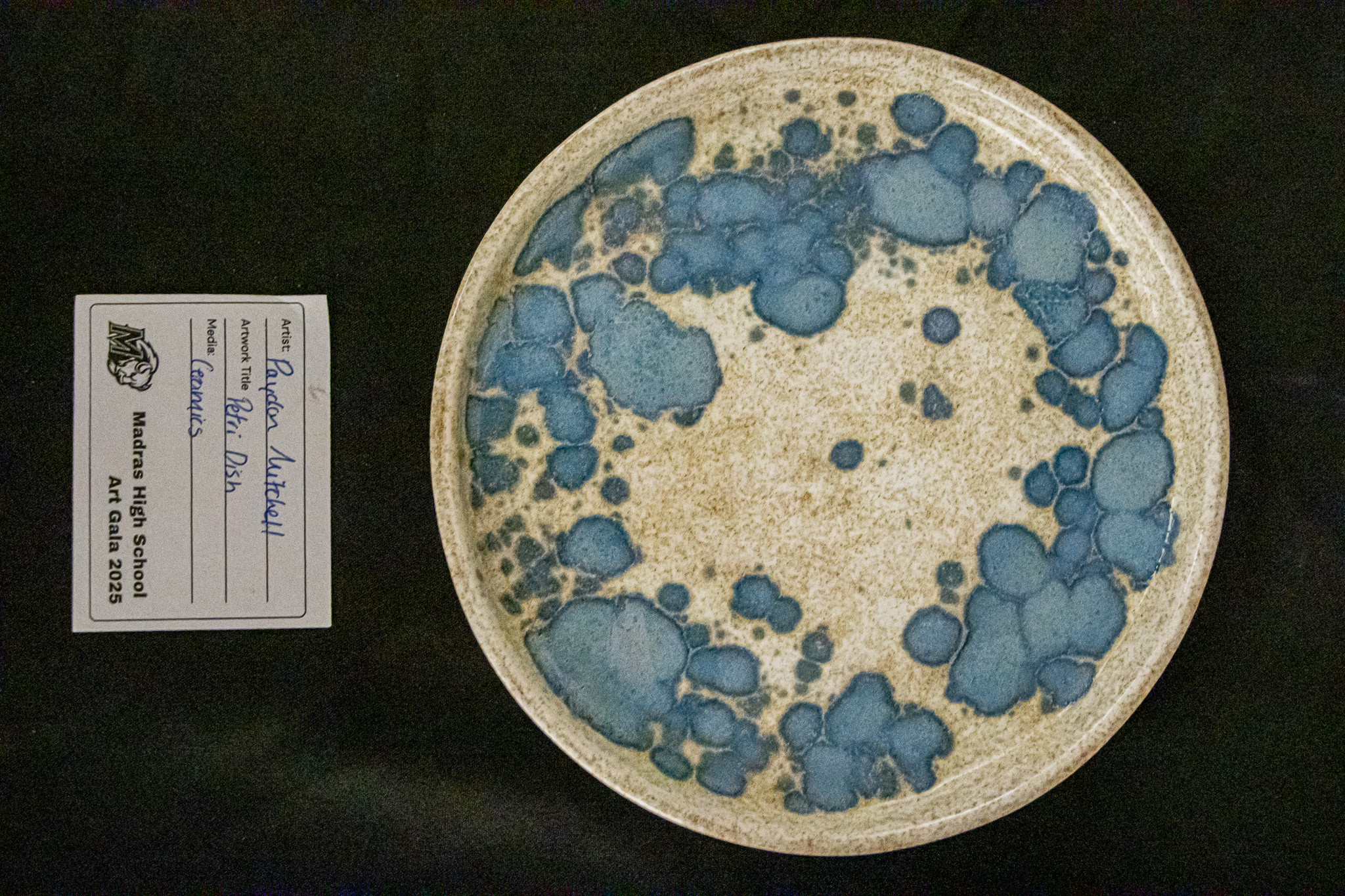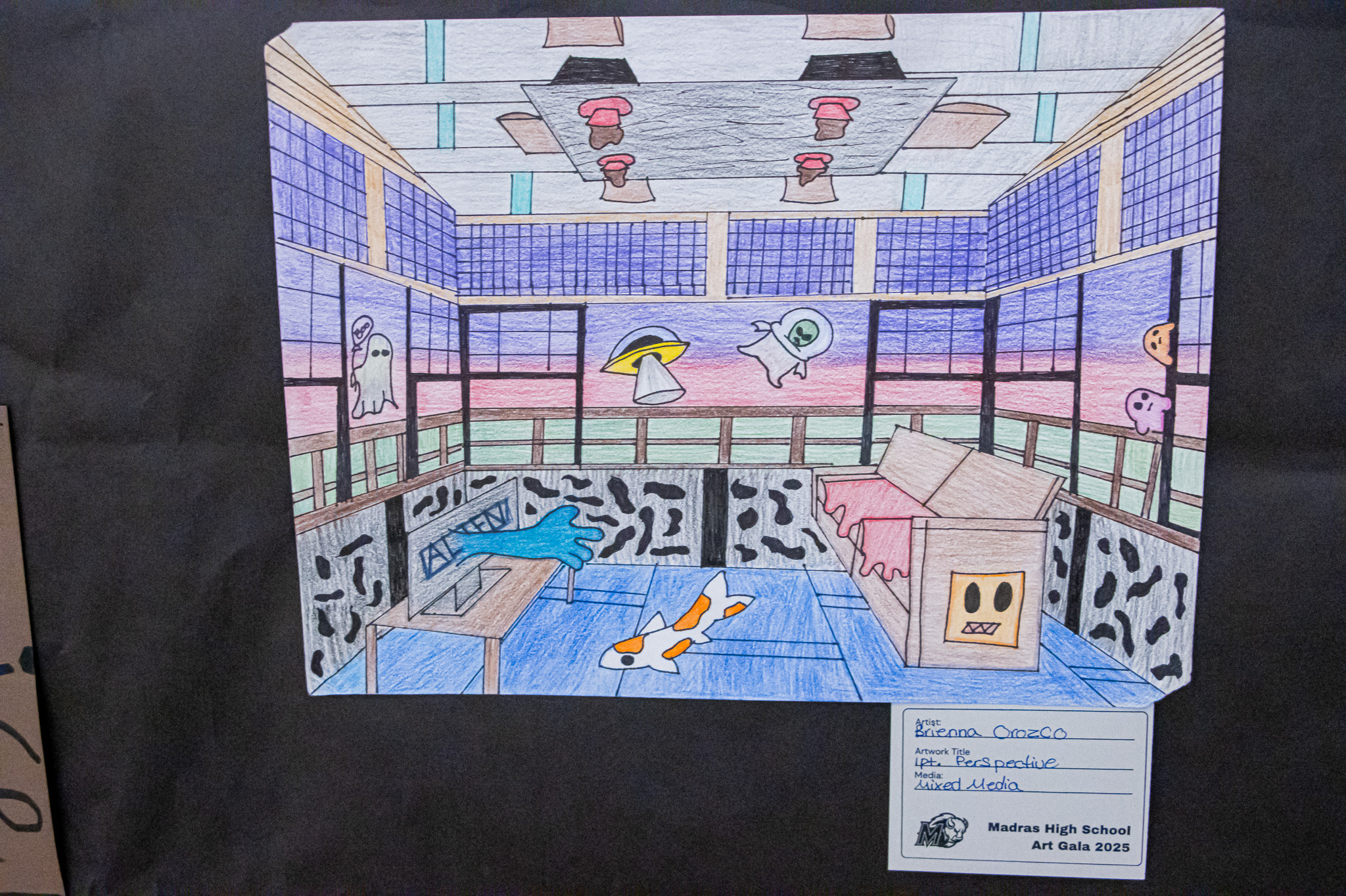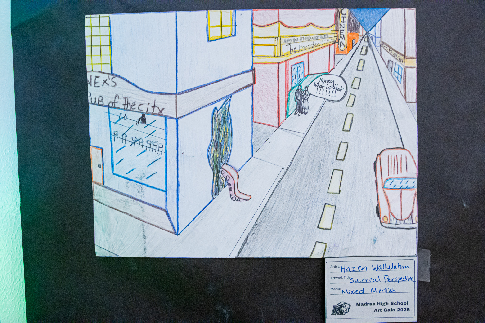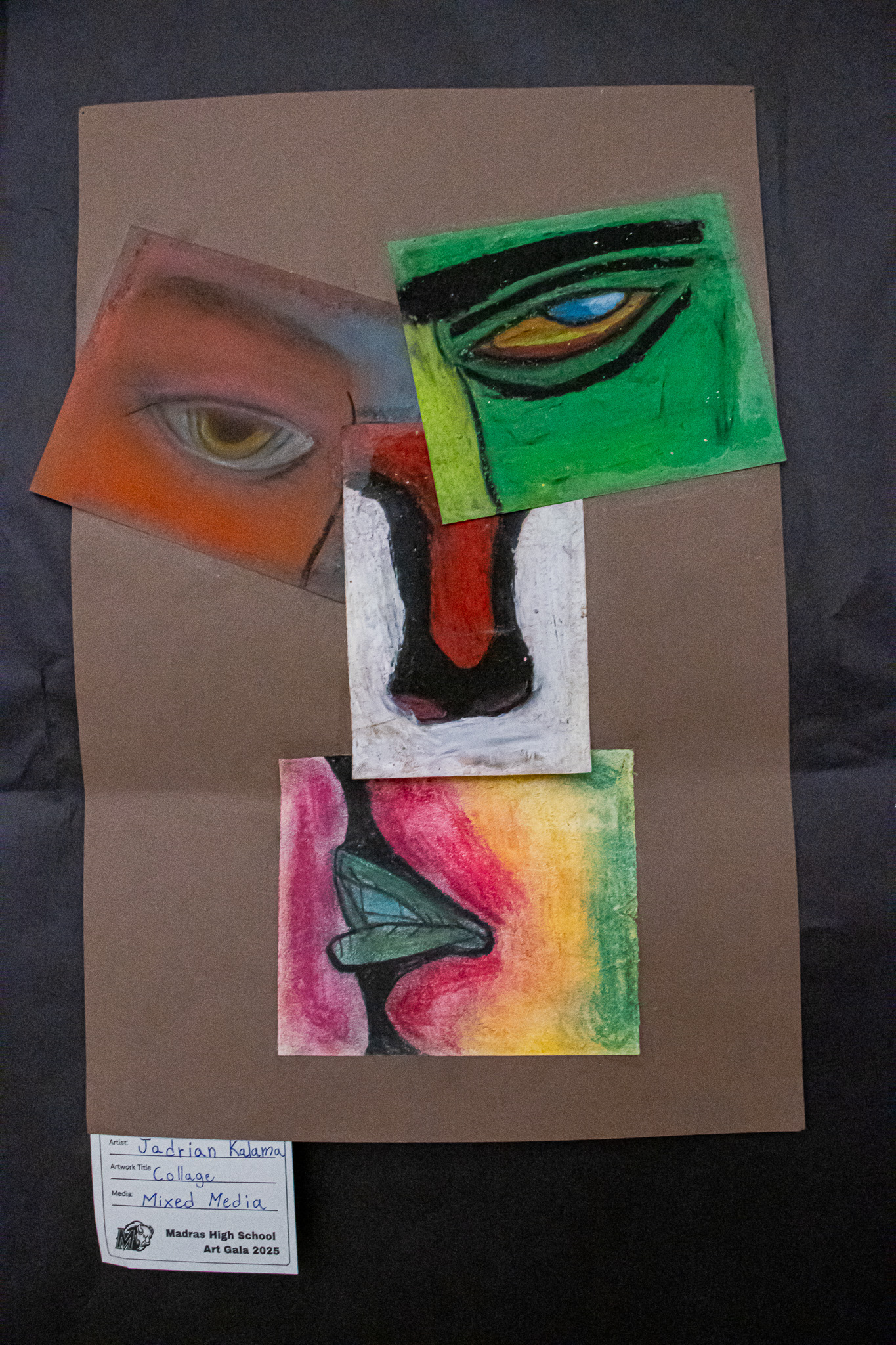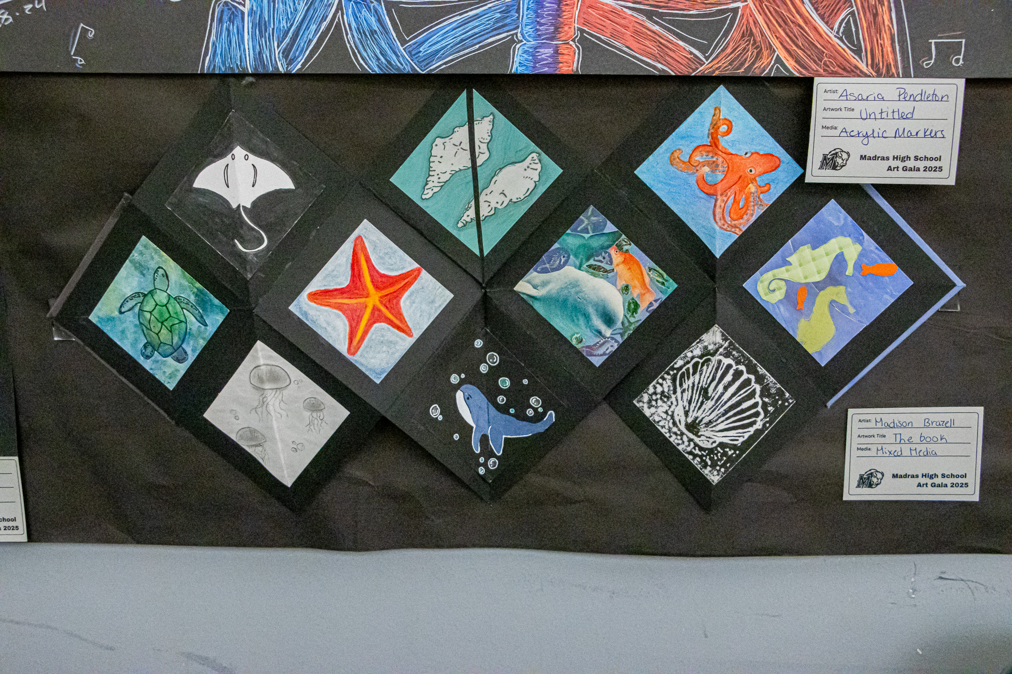 For the first time in its history, the commons of Madras High School was transformed into a vibrant art gallery for our inaugural Art Gala. Student artwork covered the walls and tables inside the commons. This included different mediums of art like ceramics, paintings, graphics, photography, and more.