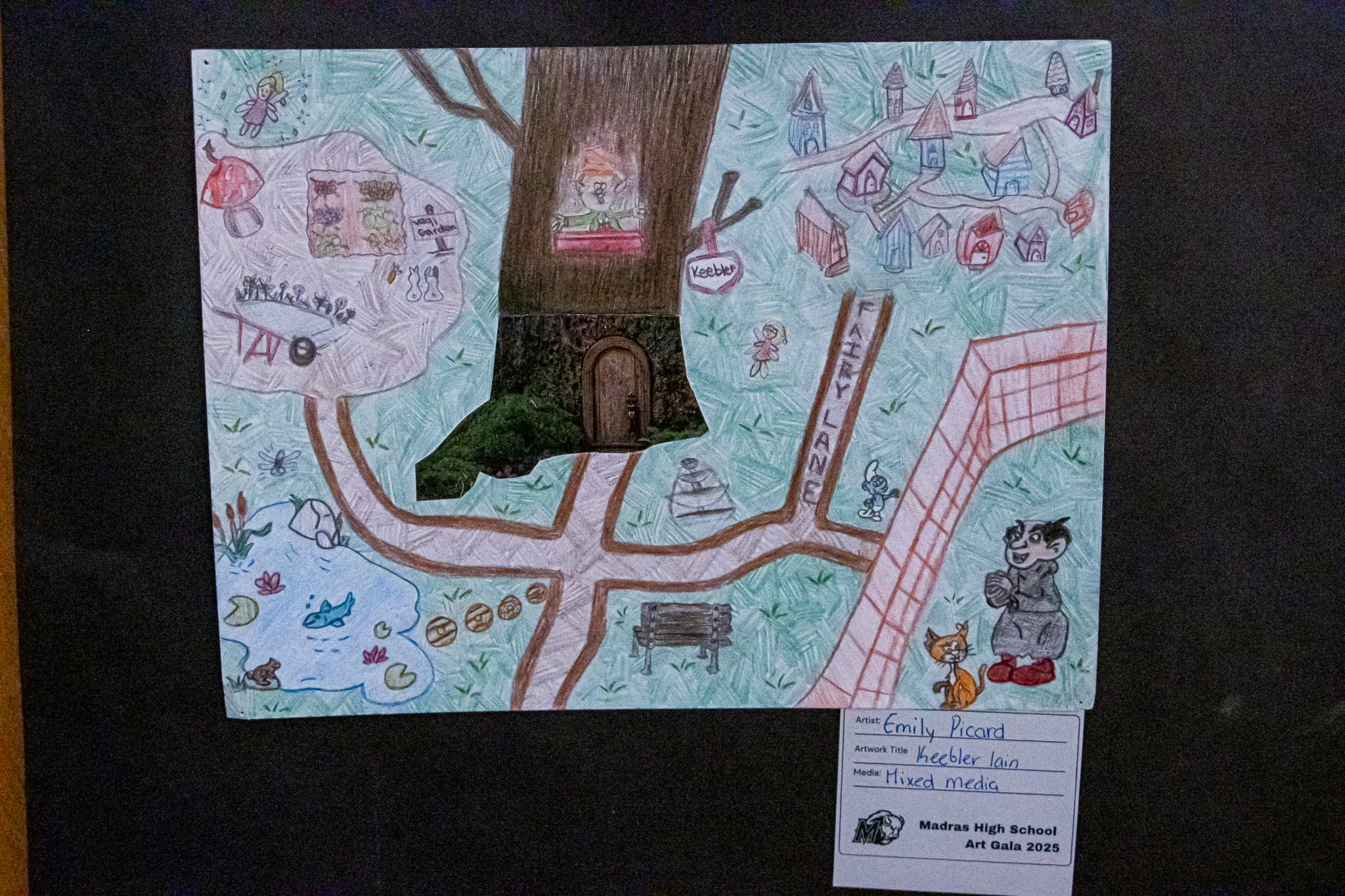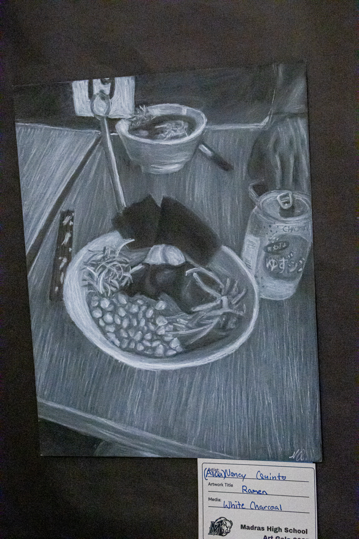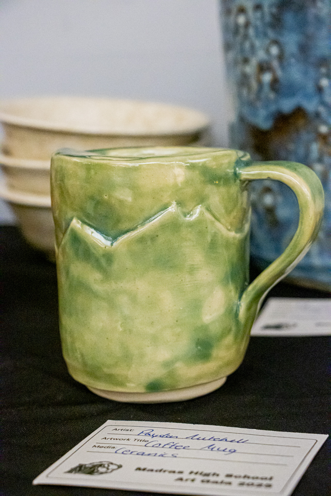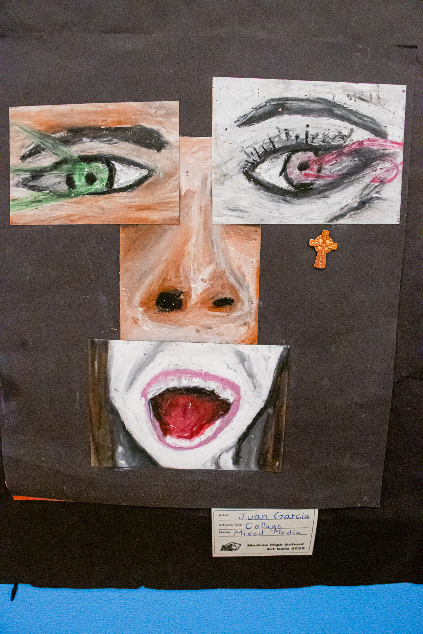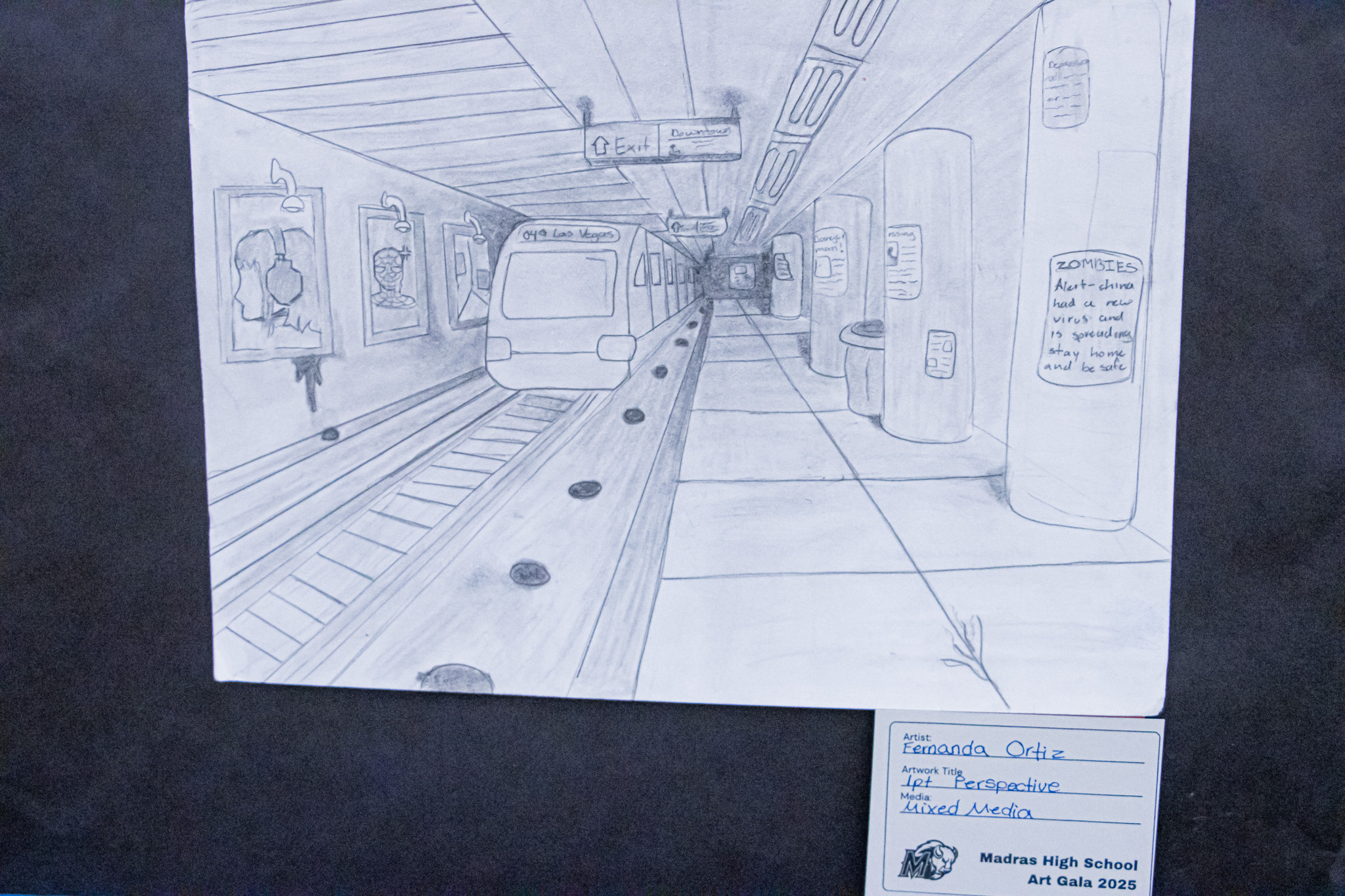 For the first time in its history, the commons of Madras High School was transformed into a vibrant art gallery for our inaugural Art Gala. Student artwork covered the walls and tables inside the commons. This included different mediums of art like ceramics, paintings, graphics, photography, and more.