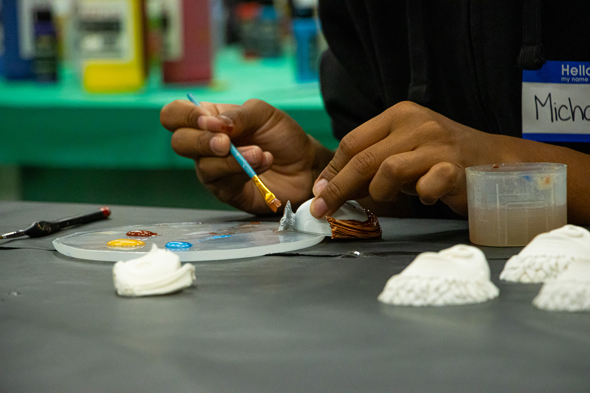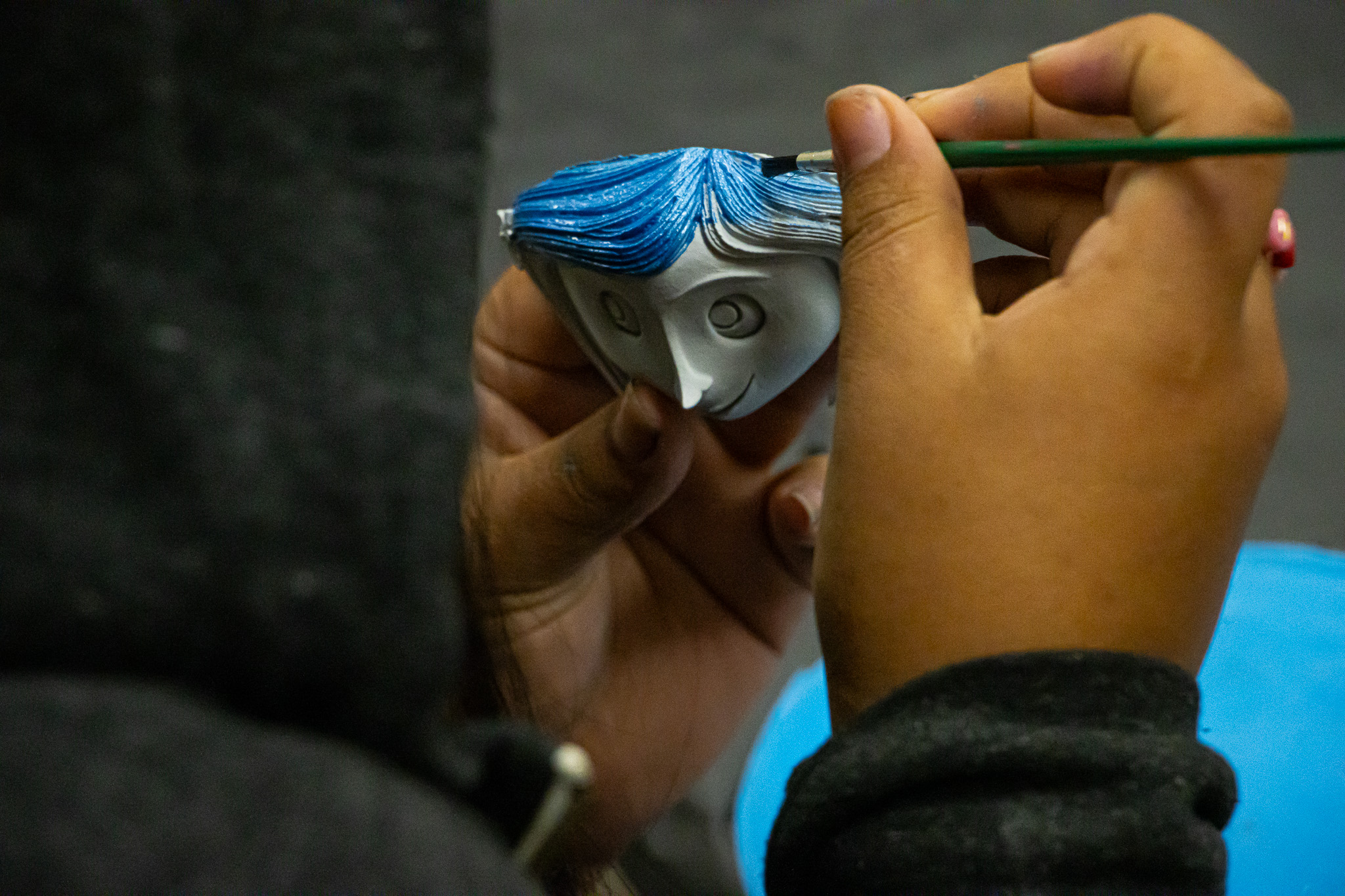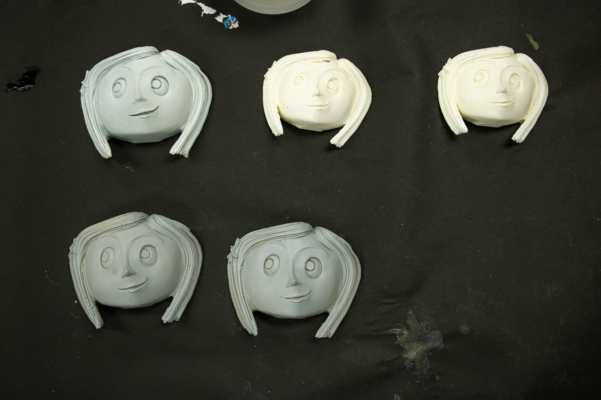 Before students could lose themselves in painting the characters, they first had to gather their supplies. LAIKA provided everything the students needed from brushes, a variety of different colors of paint, and palettes. Once students knew what colors they wanted, they could begin. Throughout the workshop, students meticulously painted the clay busts to bring their imagination to life. They focused on the different strands of hair, the eyebrows, eyes, nose, lips, skin of Coraline or Mr. Susan Link.